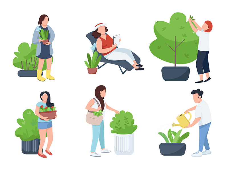 - People with plants, gardeners and botanists flat color vector faceless characters set