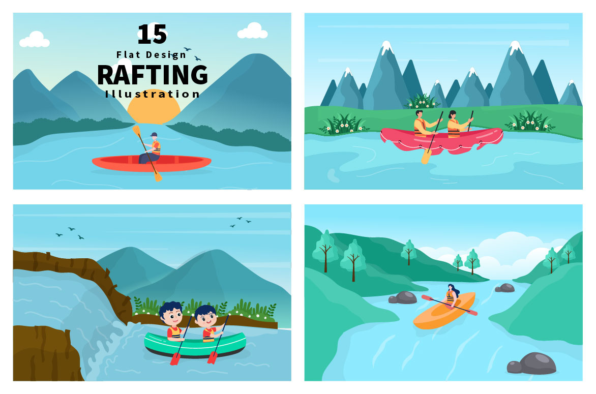 - 15 Rafting, Canoeing, Kayaking in the River Vector Illustration